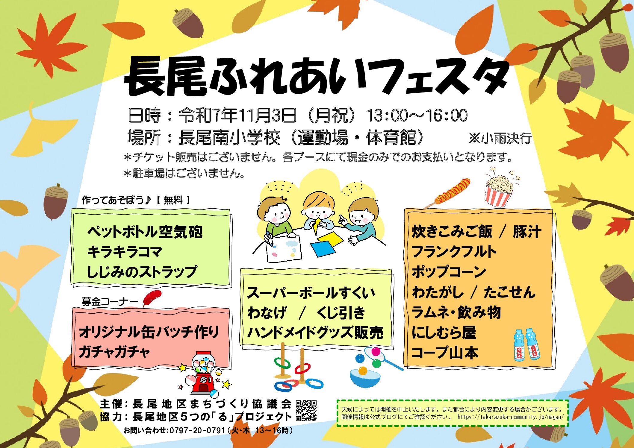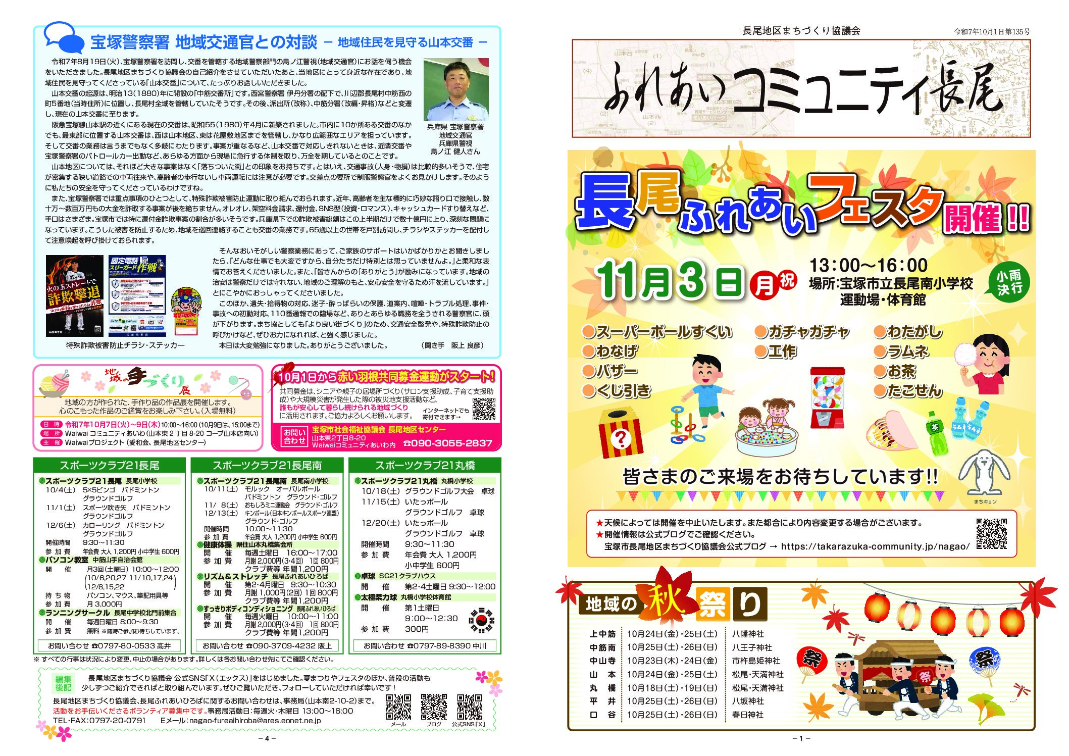 ふれあいコミュニティ長尾 第135号-2(R7.10) 内容 ★長尾ふれあいフェスタ開催!! 11月3日(月・祝)少雨結構 13:00~16:00 場所:宝塚市立長尾南小学校(運動場・体育館) ・スーパーボールすくい、わ…