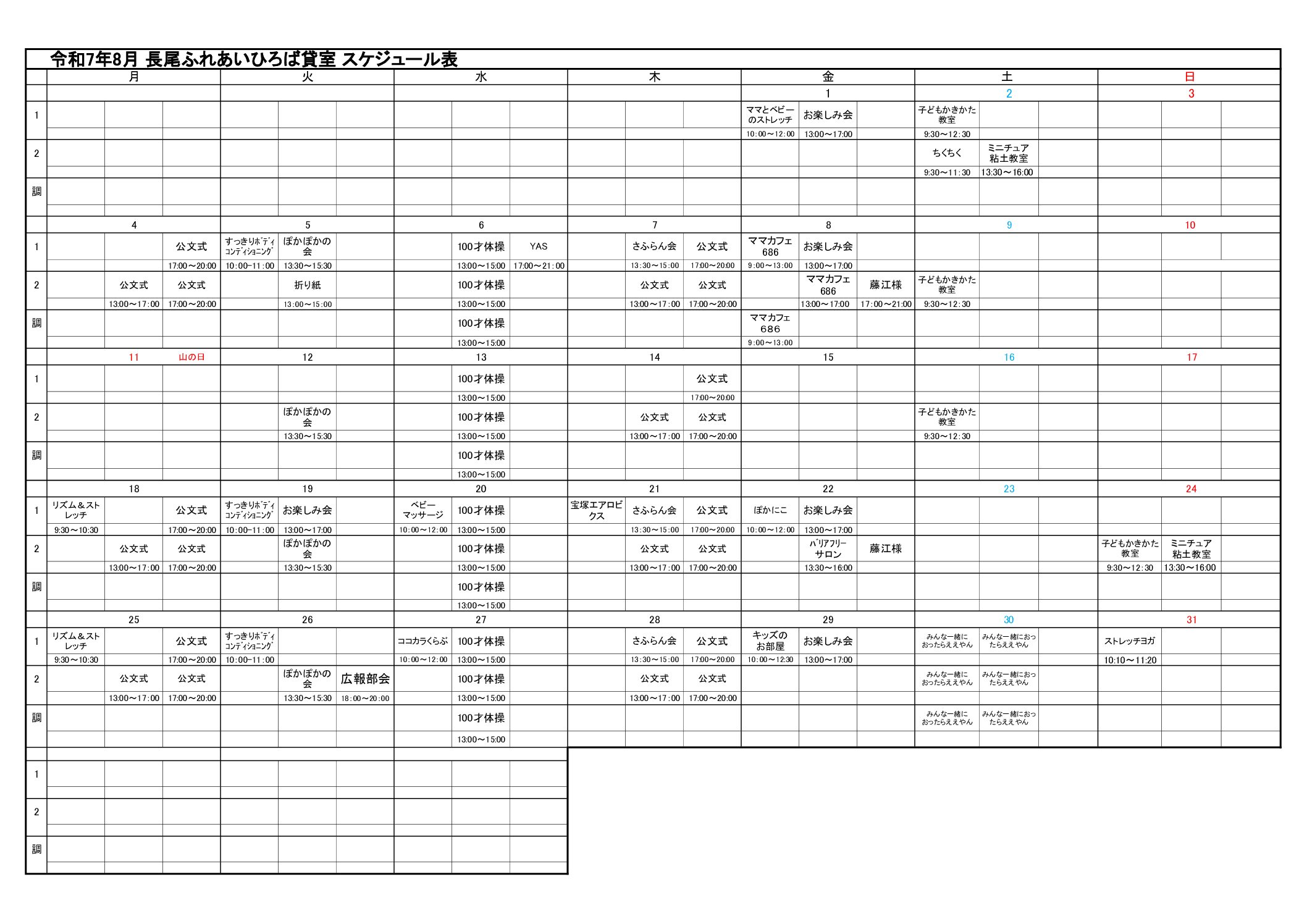 長尾ふれあい広場(令和7年8月度)の貸室利用状況です。 (現在は10月までの予約が可能です) 先日のふれあい夏まつりには暑い中多くの方のご来場ありがとうございました。 皆さんお楽しみいただけましたか? 大きなけがもなく皆…