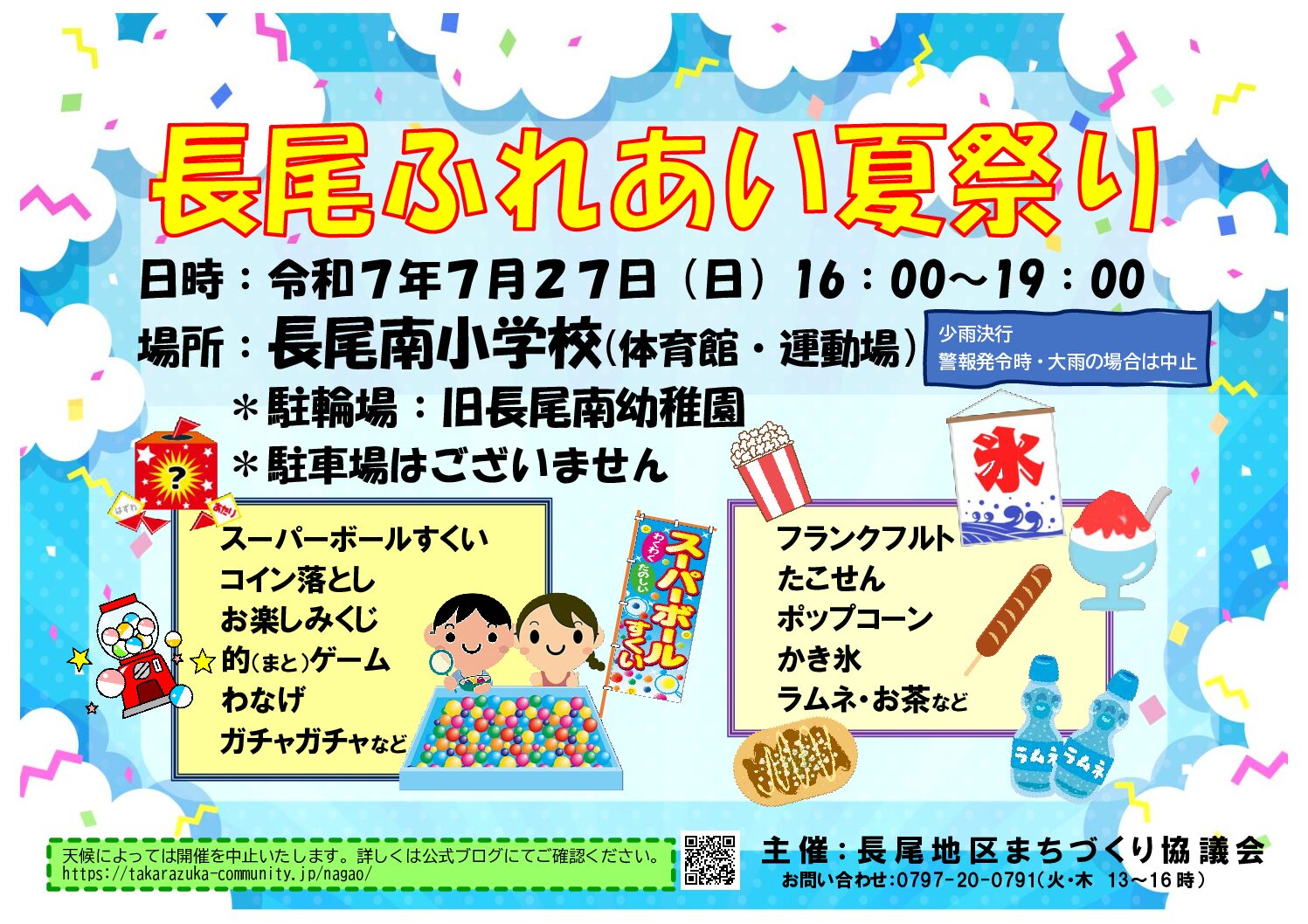 長尾ふれあい夏まつりを開催します! 開催時間は16時~19時 まだまだ暑い時間帯ですので熱中症対策を十分にとってご来場ください。 ※当日は問合せの電話に対応できません(別会場の為)、ご了承ください。 今年は会場を長尾南小…