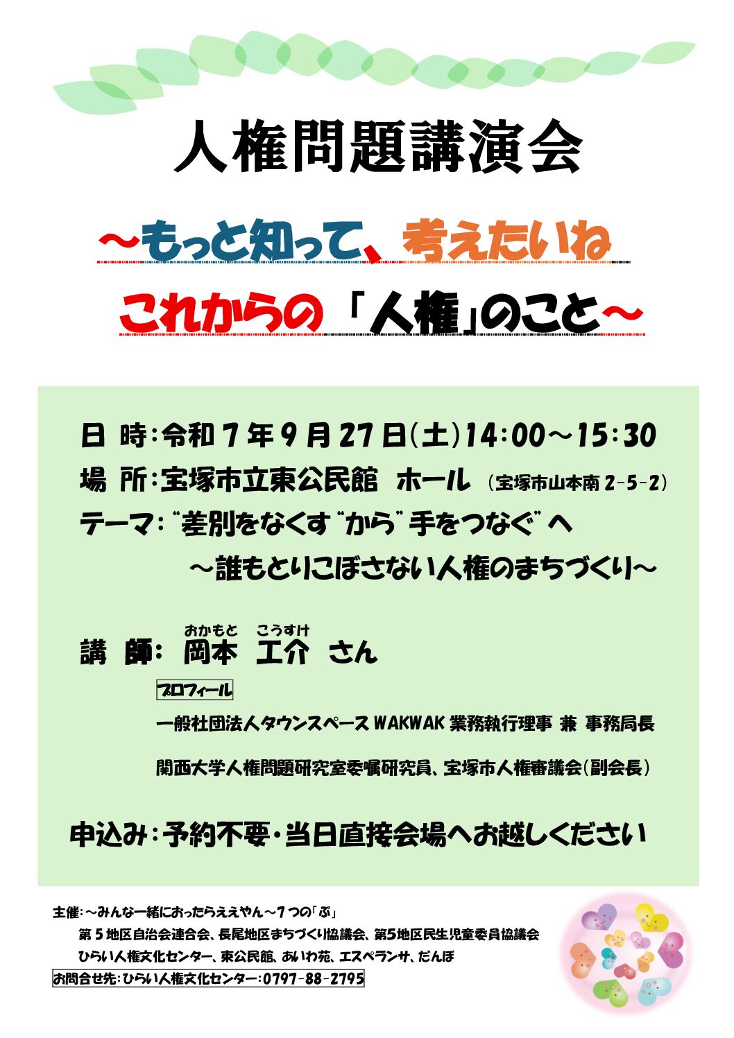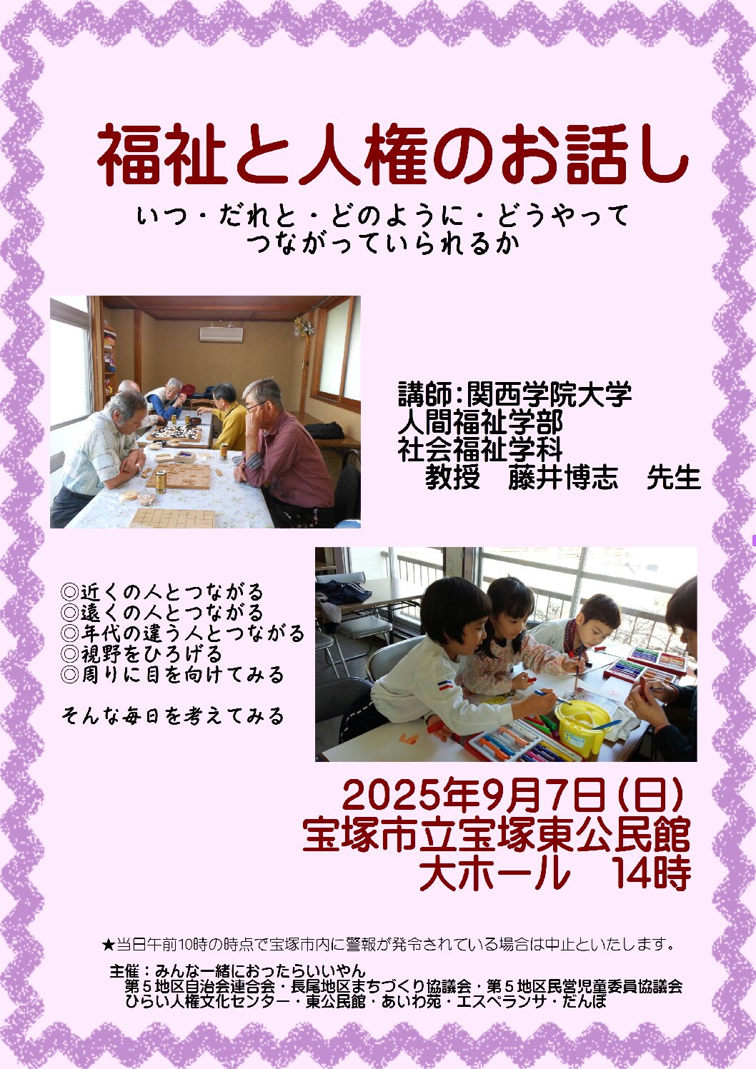 『福祉と人権のお話し』 ~いつ・だれと・どのように・どうやって つながっていられるか~ 入場無料の講座です。是非ともお越しください。 日時:2025年9月7日(日)14時~ 場所:宝塚東公民館 ホール 講師:藤井 博志氏…