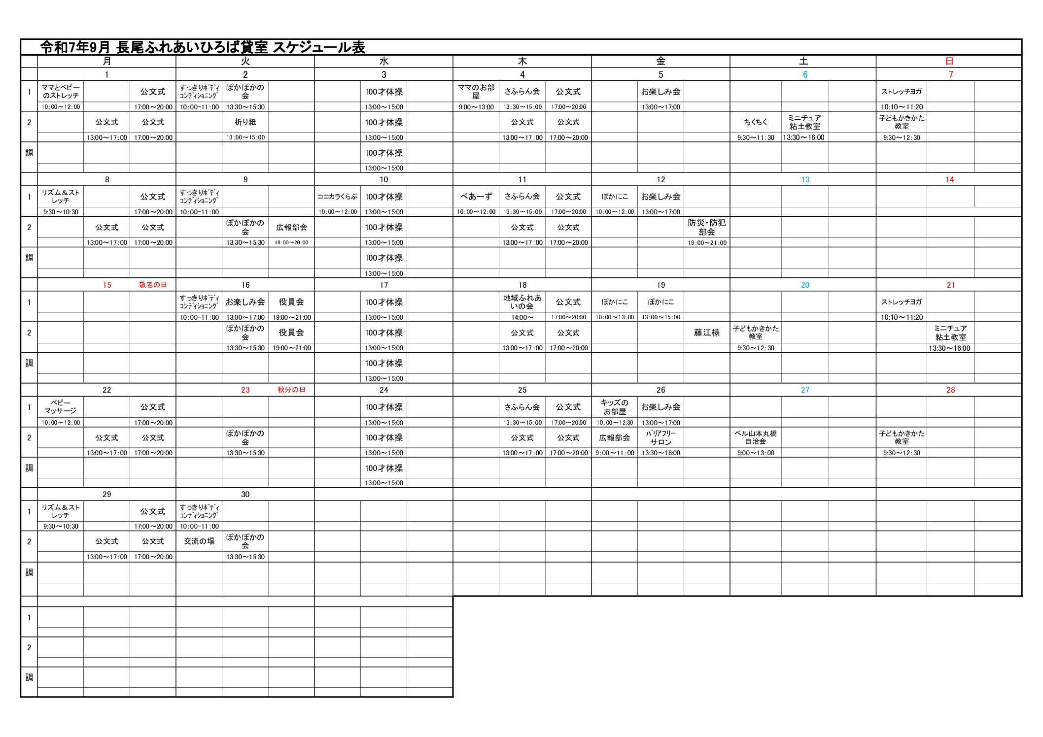 長尾ふれあい広場(令和7年9月度)の貸室利用状況です