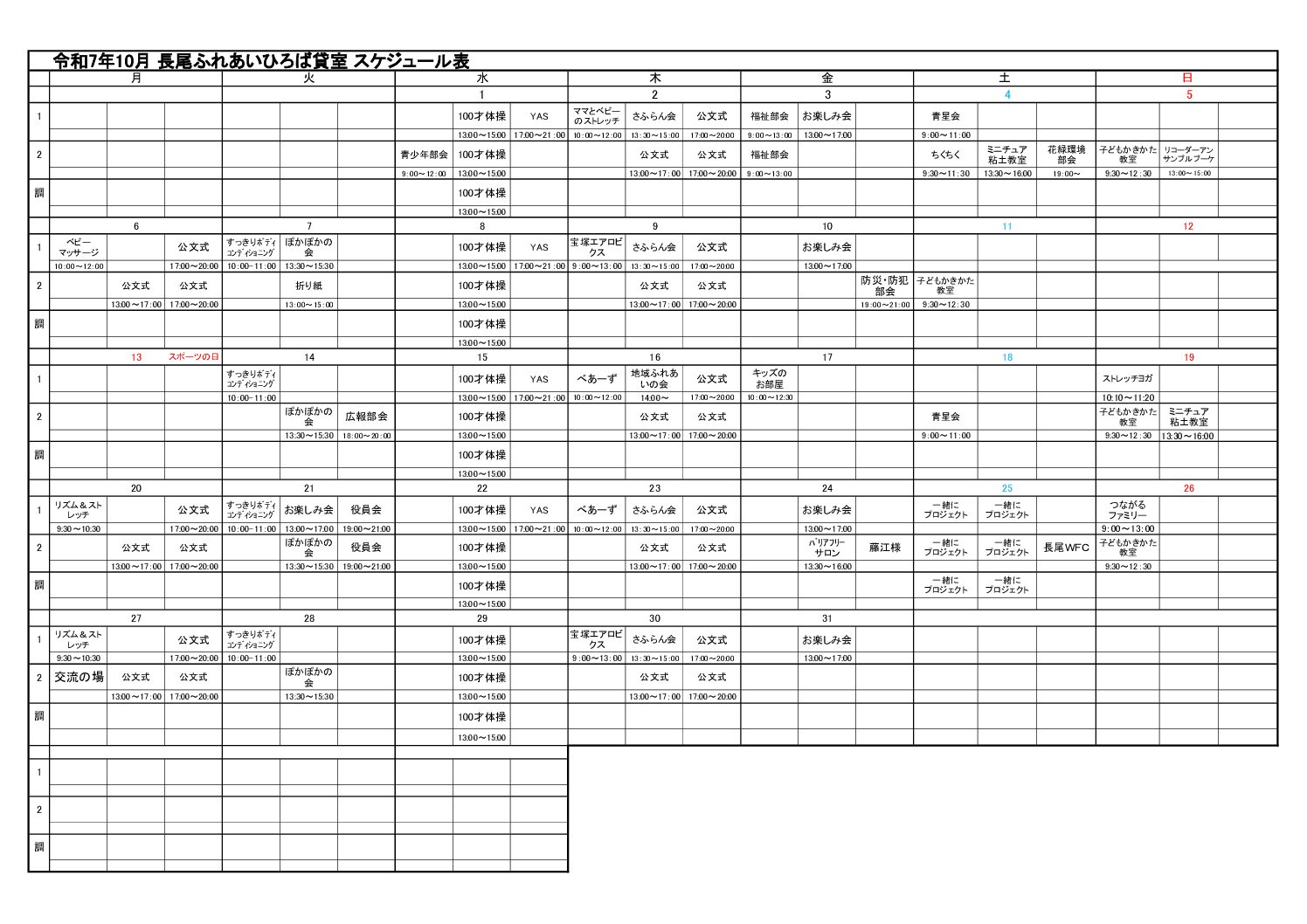 長尾ふれあい広場(令和7年10月度)の貸室利用状況です
