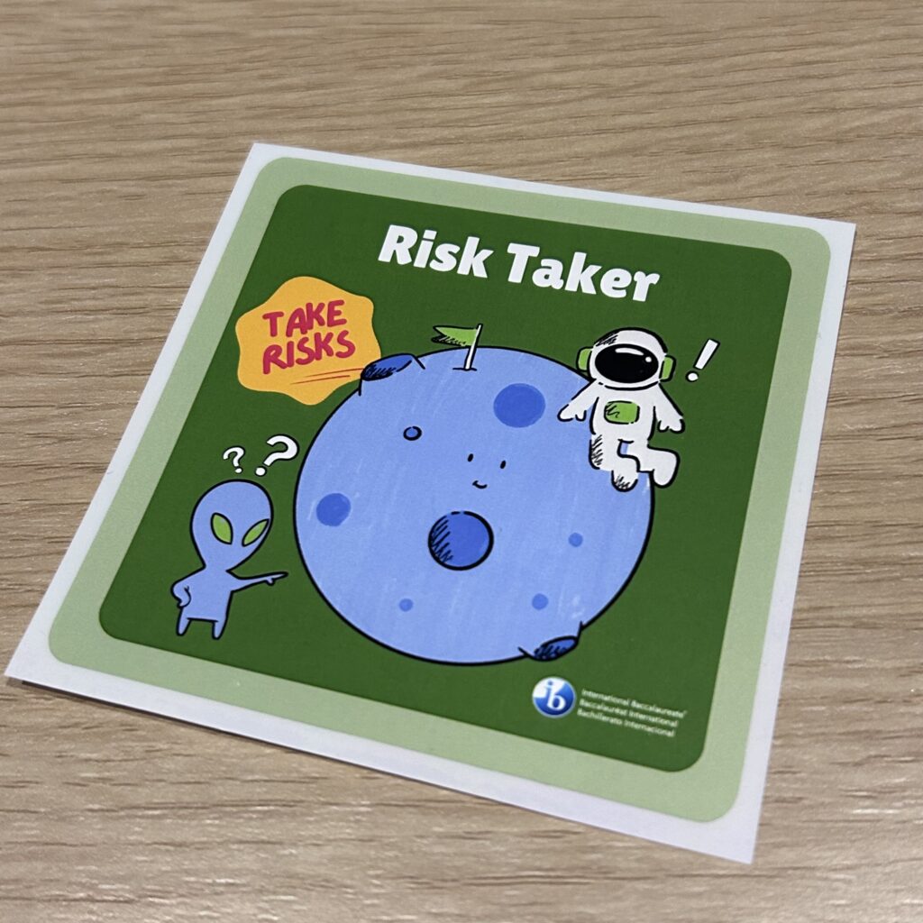 IBの学習者象をイメージするステッカーだそうです。いただいたステッカーは「挑戦する人」をイメージしているとのこと。