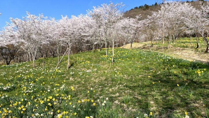 斜面の上から下まで広がる満開の桜。その足元には、黄色と白の水仙が群れをなして咲いています。ピンクと白と黄色が重なり合うその景色は、ここでしか出会えない色彩の饗宴です。