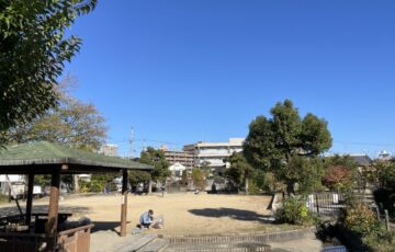 末広中央公園の広場で数人が遊んでいる姿がとても小さく見えている。青空が広がり、遠方には小学校や山並みが見える。