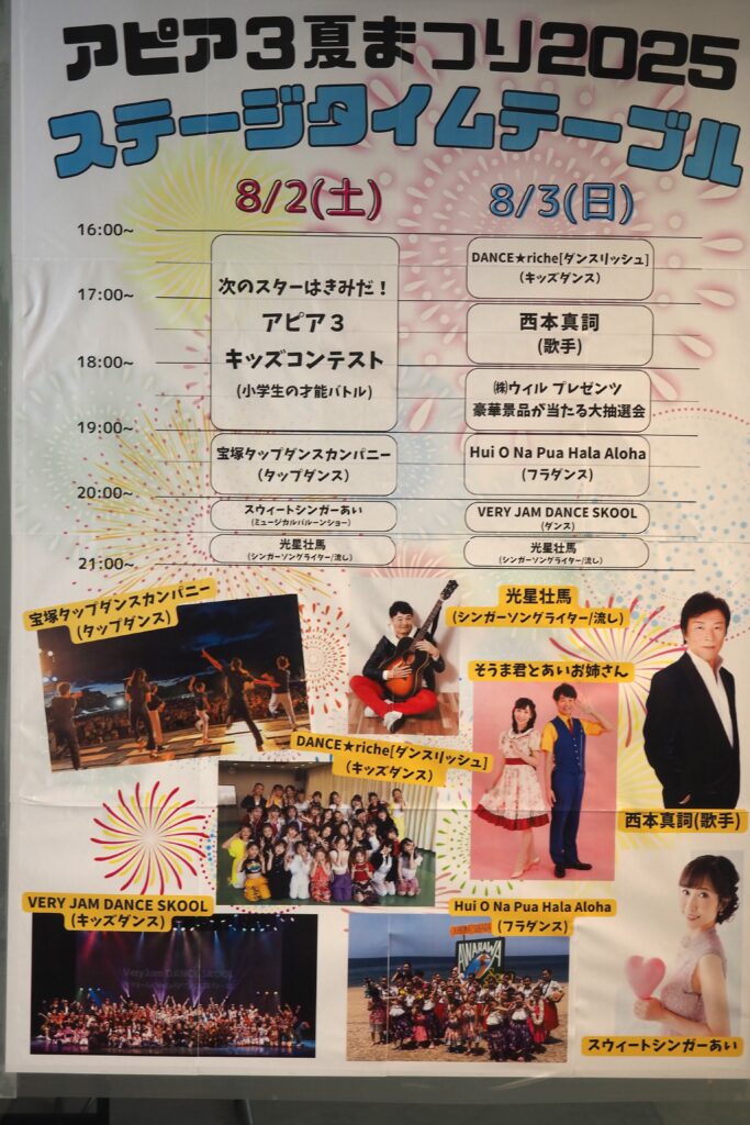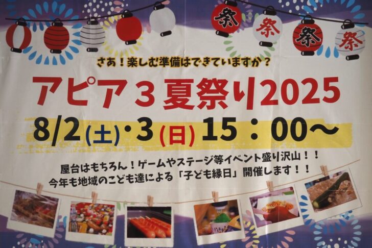 2025.07.29 自治会・地域だより このページを印刷 コミュニティ末広 アピア3夏祭り2025 今年もアピア3の夏まつりがアツい!^ ^ ステージやゲーム、コンテストに大抽選会、人気の屋台メニューに加えて、今年も地域の子どもたちによる「子ども縁日」は両日とも16:00~18:00開催だそうですよ。 発見!ぶるちゃんがミャクミャクバージョンになっていた。(笑)
