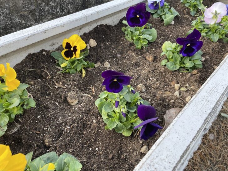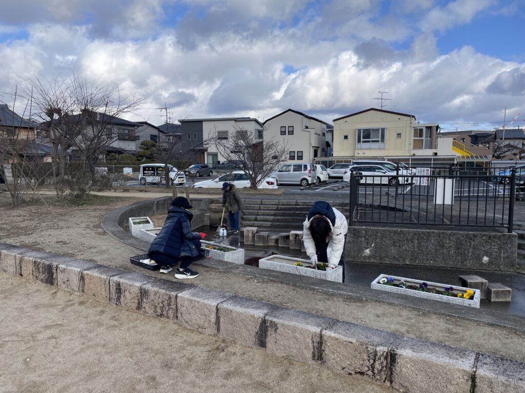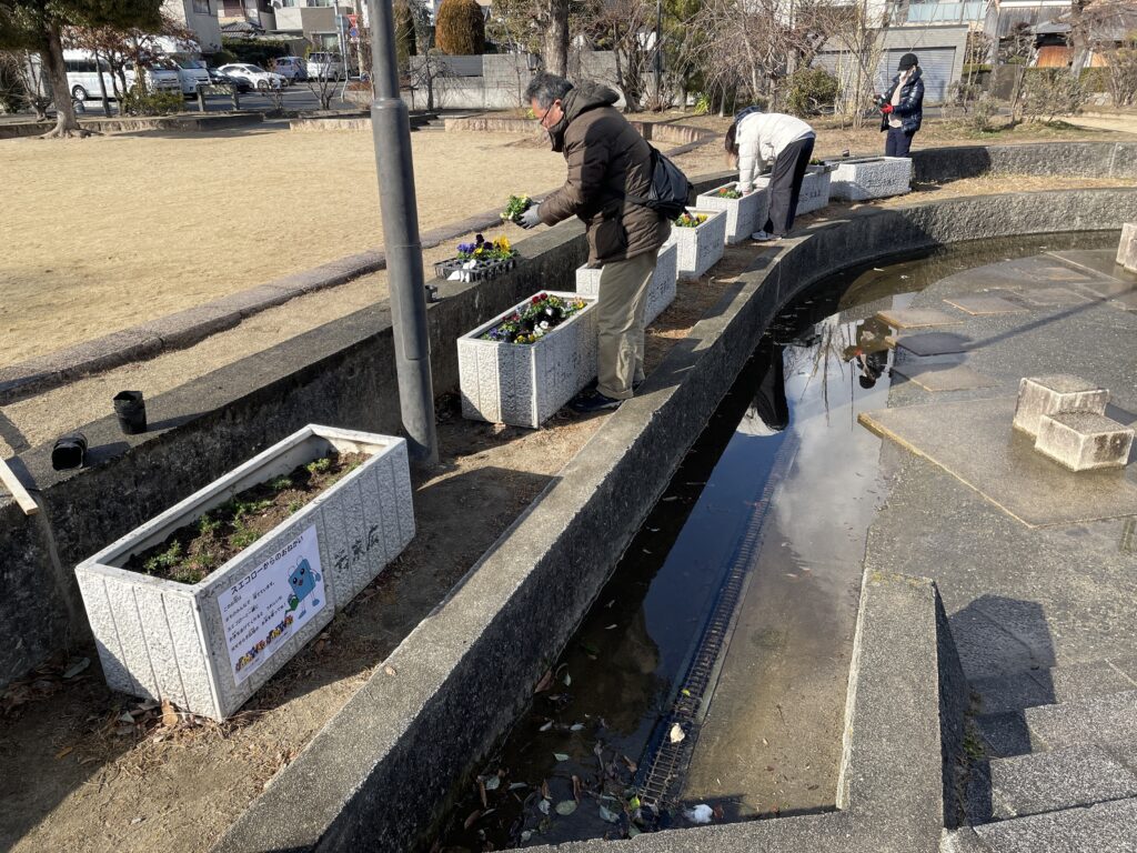 2026年1月25日(日)の午後、伊孑志のせせらぎ広場のプランターにお花を植えました。