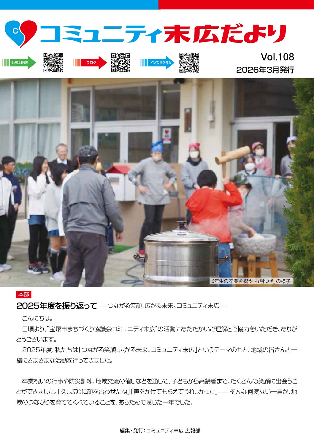 2026年3月4日(水) すっかり恒例となった、6年生の卒業をお祝いするお餅つきです。 今年の6年生は3クラス。 みんな元気でよい笑顔です!各クラスとも「かけ声」が面白い。^ ^ …