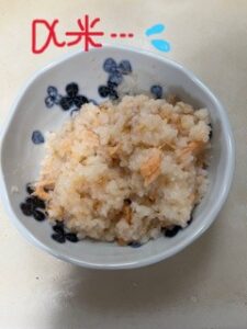 でもチャレンジ👊 ①は《1合にお湯200cc》 ②《1合にお湯150cc》で硬さチェック。②はパラパラご飯で問題外👋 ①は少し柔らかめだけどこれくらいが良いと思える。120ccのだしを加えておかゆ風に。今日は鮭のハラスにたっぷり塩で焼いてほぐして混ぜ混ぜご飯にしてみました。塩っけ多めが食べやすいな(わたしの健康問題では塩×なんだけど(・_・;) まっ、そこはおいときましょう“(-“”-)” ハッキリ味になったのでまあまあかな。美味し~って言えないけど(味覚問題もある)不味いってことも無かったよ👍 お米不足の高値の今、あのどっさり箱入りα米を「おかゆ好き」の方に小分けしてあげるってのはどないだ!?(キャシーのお腹は今んとこ大丈夫💛だし(@^^)/~~~) 鍋用キューブ型のだしで味付けもいけるんちゃうかな🤔 あなたも挑戦する?