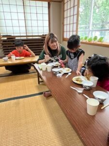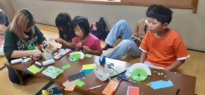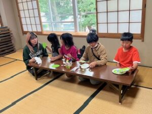 兄ちゃんたちも交じって作っとりました😛 仕上がったカエルの遊び方を…さすが小学生男児!側転カエルをあみだしとりました。