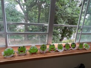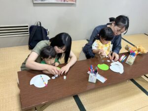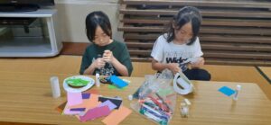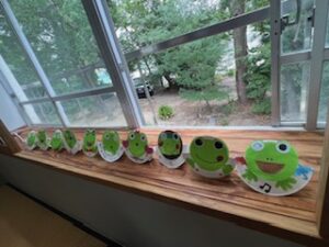 今日の工作は梅雨のイメージで「🐸カエル君」です。スーちゃんがむち打ちになったようで、えっちゃんが進めてくれました ありがとです(*- -)(*_ _)👐