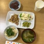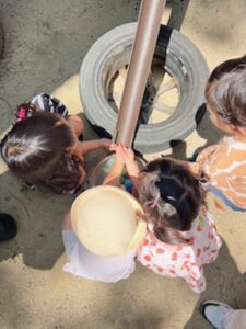 ママ達の方が「あっつ💦」がっております。40分くらいの外遊びのあとは「給食」🍴