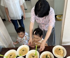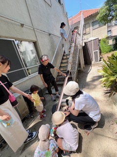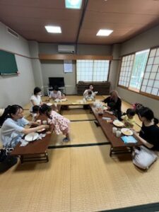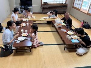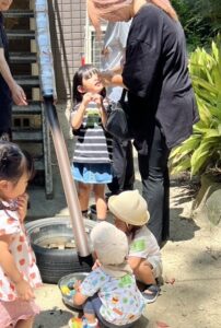 ママ達の方が「あっつ💦」がっております。40分くらいの外遊びのあとは「給食」🍴