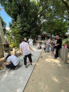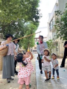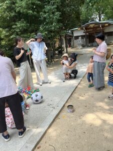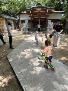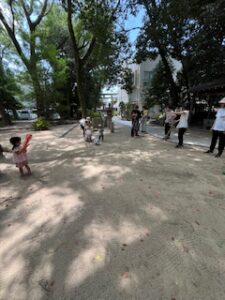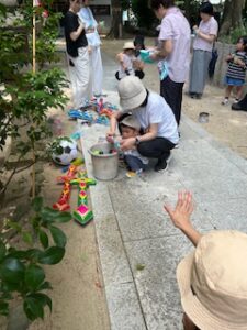 今日はですね、暑くても境内の木陰もあるから外遊びをしようっつうことで…「高速玉流し」「鈴あて」「ボールキック」「シャボン玉」で遊んでみました。