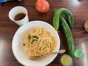 〔明太クリームスパ〕・・・いただきます( ^^) _旦~ もこちゃんちからきゅうりトマトをいただきました🥒🍅💛