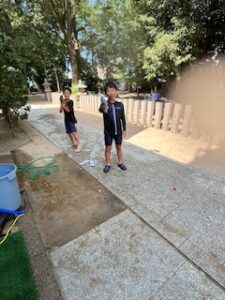 帰ると早速「水遊び」。水鉄砲でびちょびちょ😅 会館内では夕食のカレー🍛準備。野菜カットはお嬢たちも手伝ってくれた。今回も1個だけ飯盒炊飯した。なんで味が違うんかなぁ🤔美味しい✧♡ ちーちゃんが今回も炊き上げ後の蒸らしトントンを担当。煮込みを待つ間「カラオケtime」🎤 初めて取り入れておとなもこどももめちゃくちゃ楽しそうに歌っとりました♬♪時間いっぱいいっぱいレッツソング。