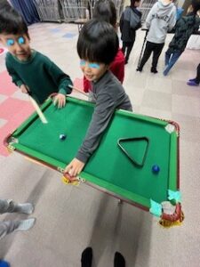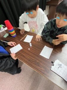 今日の遊びでボケ発生💦 3個のサイコロを使ってビンゴゲーム。自分で①~⑯の数字を用紙に書いてゲーム初めてしばらくして気が付いた『あっ(@ ̄□ ̄@;)!!①と②は無いんや( ̄▽ ̄;) アホやったな((´∀`))』『ほんまや!①①①やんか』で、仕切り直して③∼⑱で16マスを埋めた。思いのほか盛り上がって何回もチャレンジしてた。