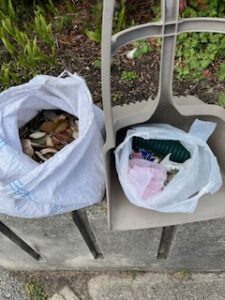 🍂が土嚢袋半分くらい。ごみっこはいろんな種類があちこちに…吸い殻は相変わらずだ。